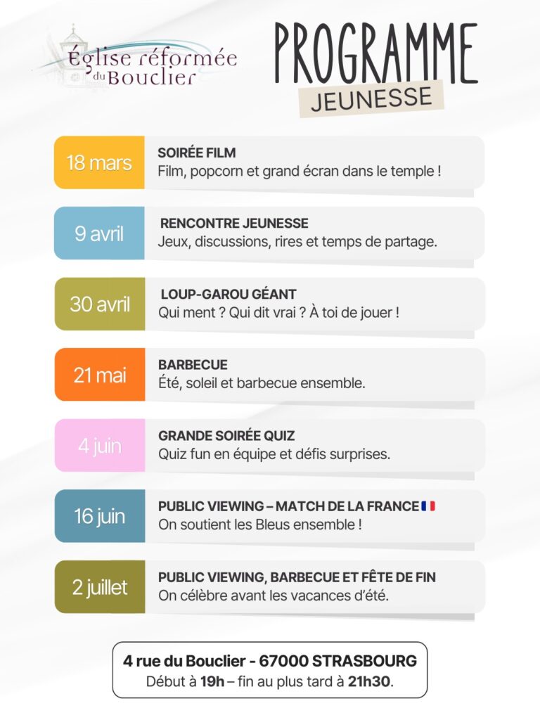Le Bouclier wishes to be, above all, a lively Reformed parish. As heir to the first Reformed community founded by Jean Calvin, « Le Bouclier » (The Shield, named after the name of the street) is made up of 1,200 members and accompanied by two pastors.